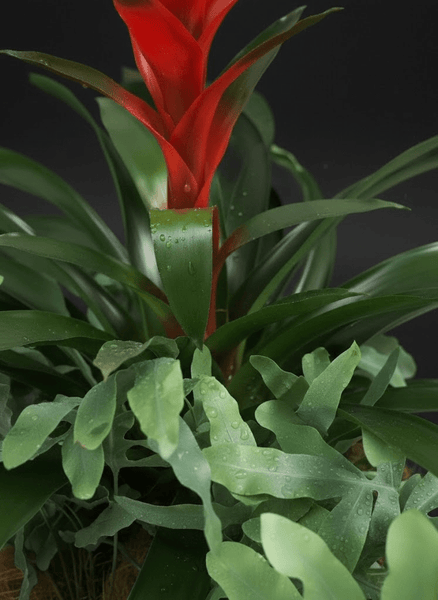 💧 Agua: Vierte un poco de agua en el "tanque" central de la Bromelia cada semana. Al helecho le encantará que pulverices sus hojas con agua ocasionalmente y mantén el sustrato siempre ligeramente húmedo (sin encharcar).